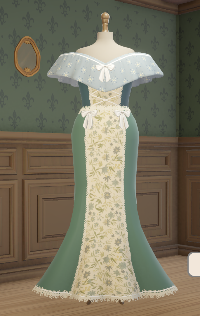 I really love the updates! I'm so happy they added lace. It allows for a lot more creativity. The way the sewing works now was a little hard to adjust to since I'm used to the older version, but I have to say it is a lot easier now! The only thing I want to say is to make the lace overlay a little easier to do. It's not difficult, but it does get messed up, so you have to pin it down in shorter pieces. Maybe for longer sections it would be nice to may it lay it down for you, and you can choose to select that section to overlay the lace onto. I think that would be great and make it easier for a lot of people. Anyway, I want to show what I did with the ribbon hemming because it's so beautiful! Please add more colors for ribbons!