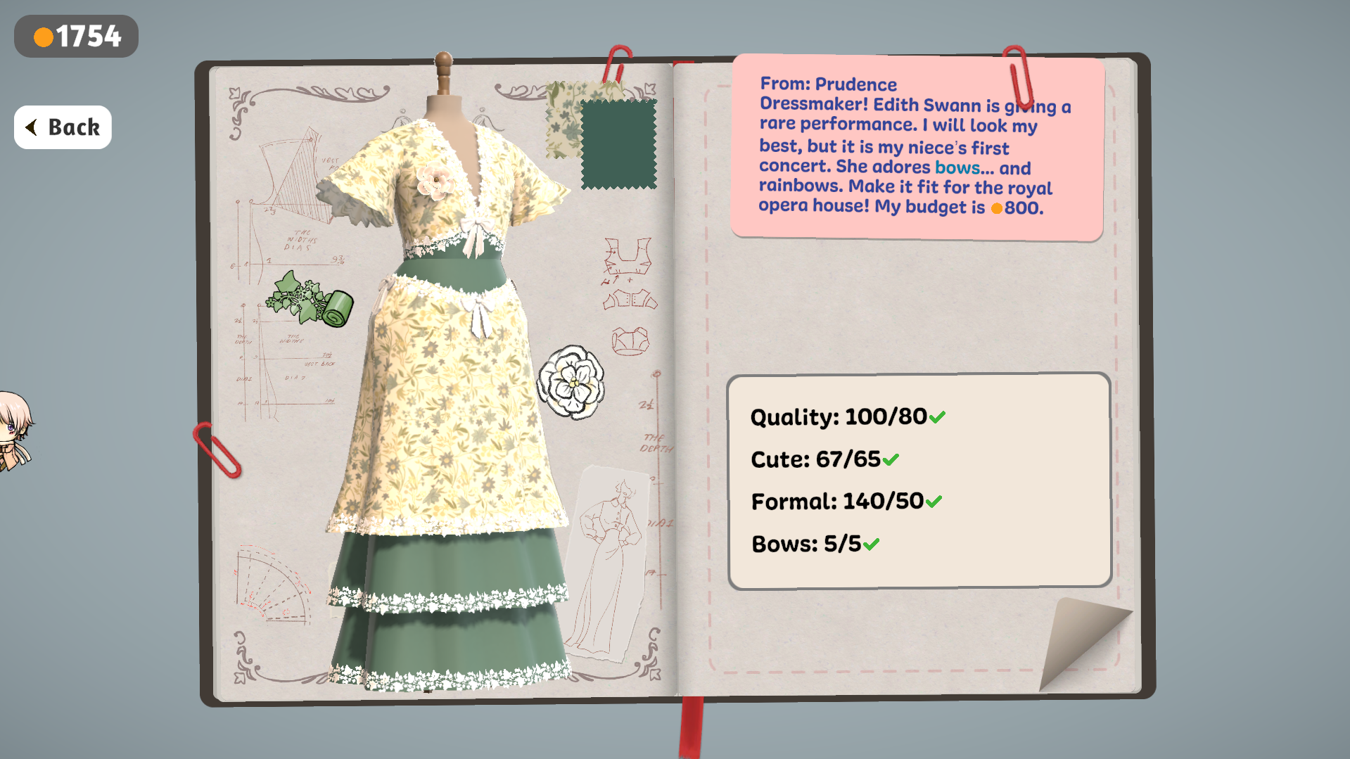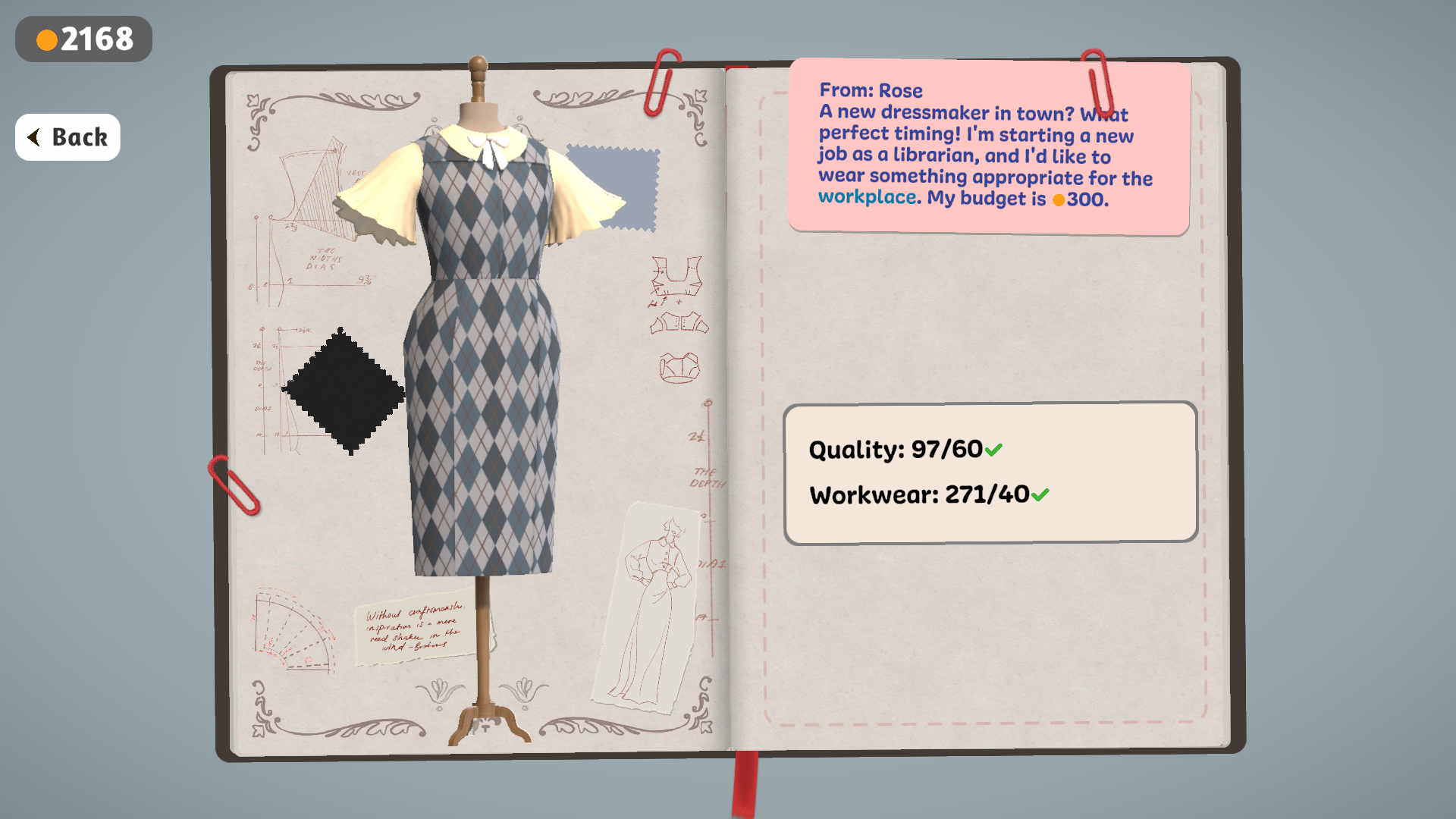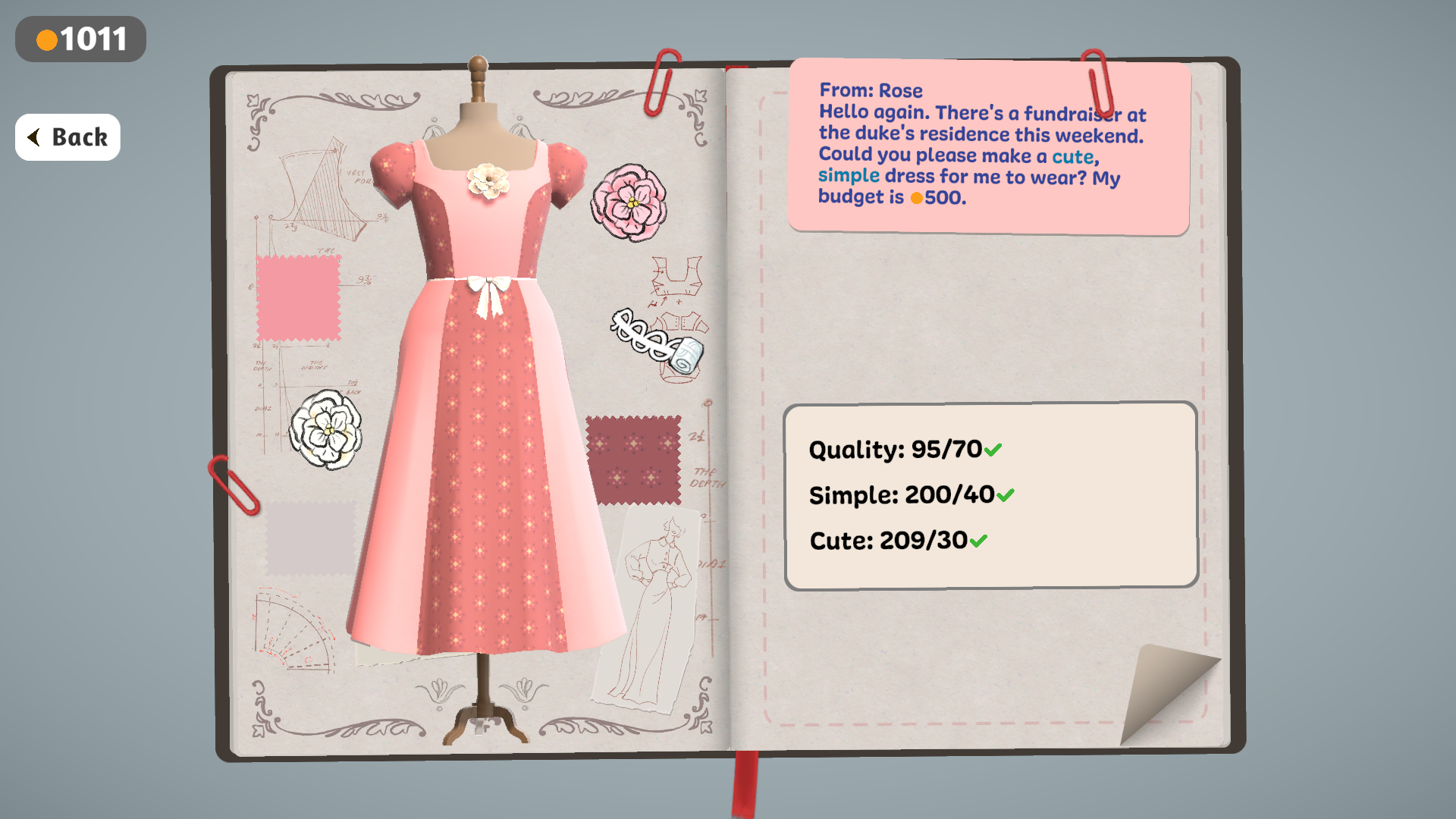 I REALLY loved this game!! I already wishlisted it on steam and definitely gonna buy it once it comes out. I would really love it if you could try the fabric on the sketchbook, cause sometimes I picked 3 different shades of a colour but couldn't find fabric that matched the idea. I also got mixed up while cutting the patterns because I was having trouble figuring out which pattern belonged to a certain part of the dress, maybe it's because I'm a native Spanish speaker and maybe I didn't know the names? But overall LOVED IT!!!!