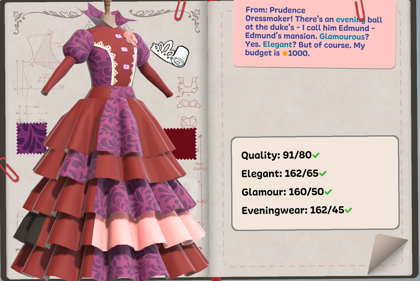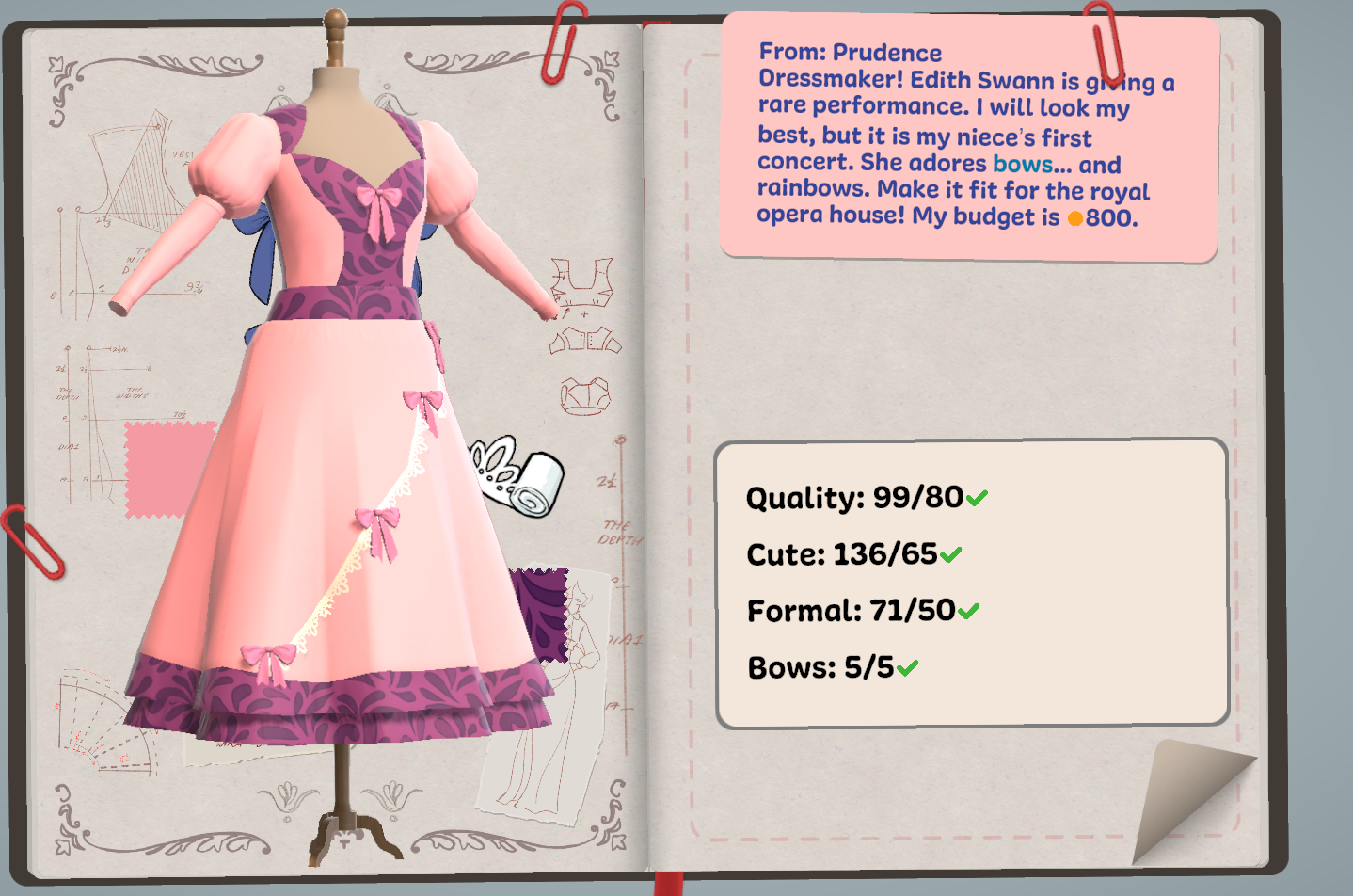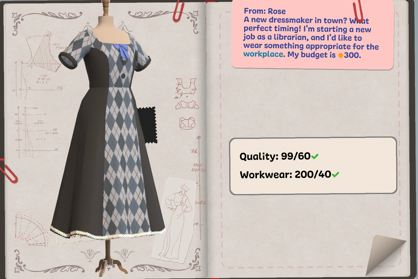 Really enjoyed playing the prototype and will defiently purchase the game once the final version is released on Steam. I'd love the ability to be able to name our own 'creations' in the sewing journal, example 'The Eurydice dress' etc. I hope there will be more dress designs and patterns too :)