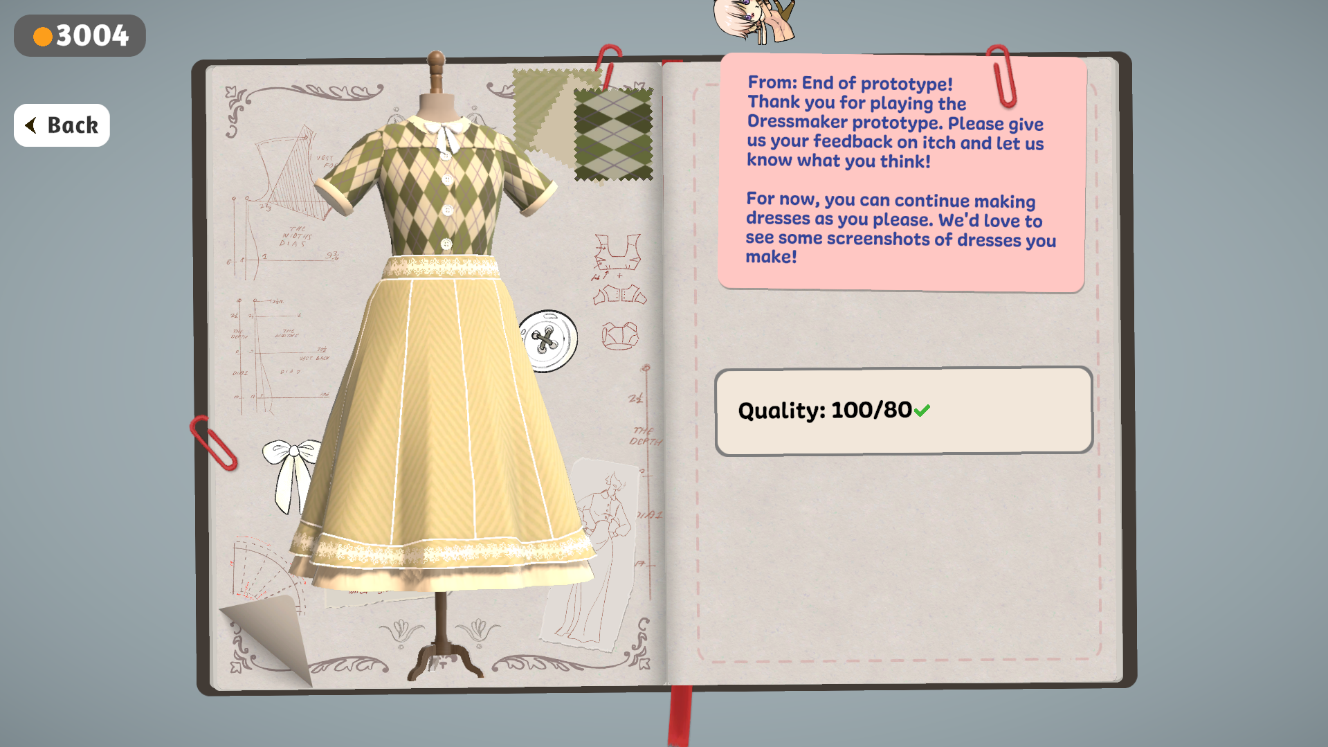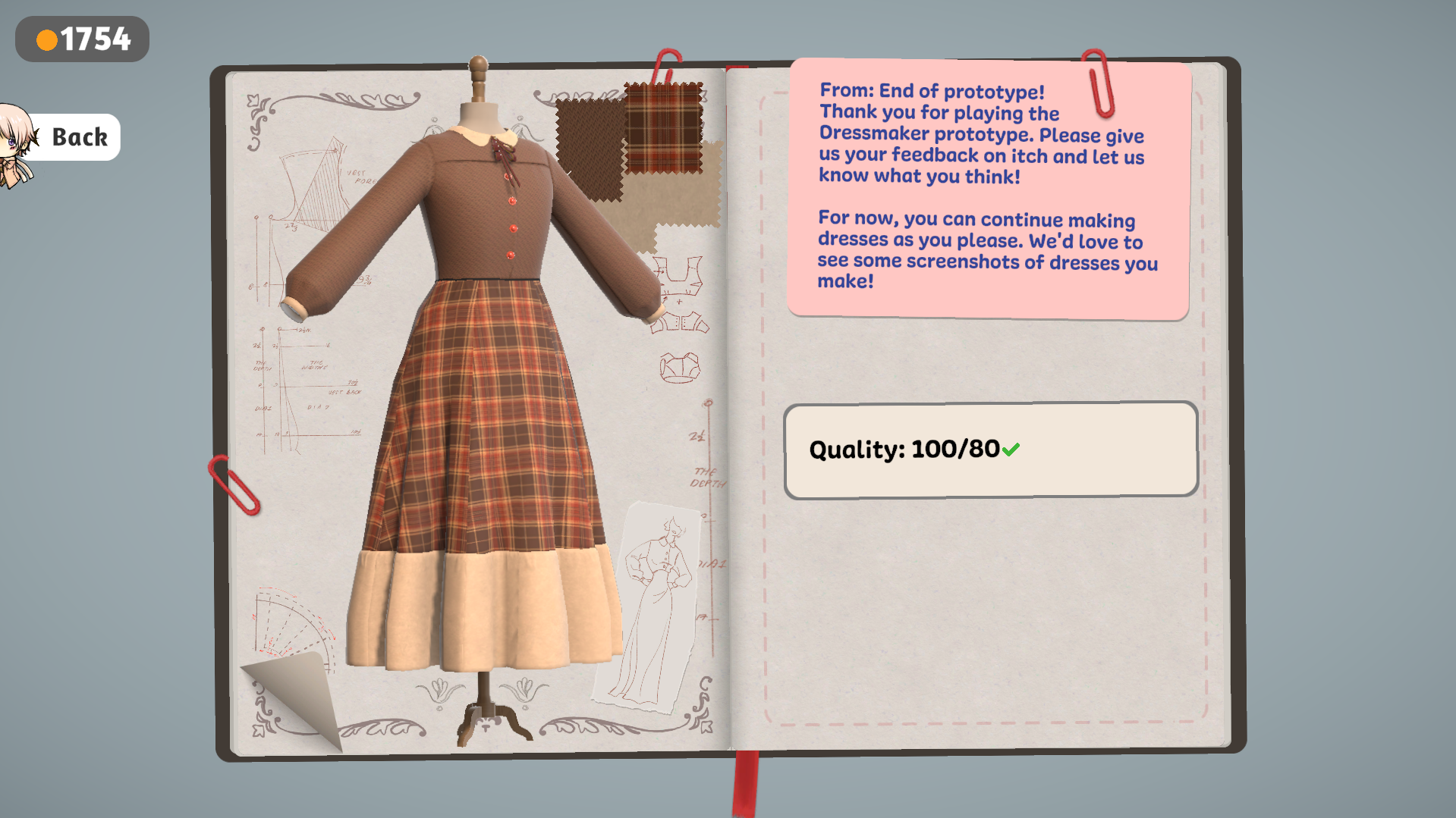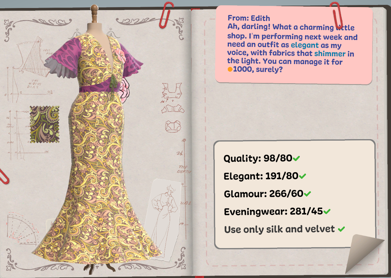 Really enjoyed playing the prototype and will defiently purchase the game once the final version is released on Steam. I'd love the ability to be able to name our own 'creations' in the sewing journal, example 'The Eurydice dress' etc. I hope there will be more dress designs and patterns too :)