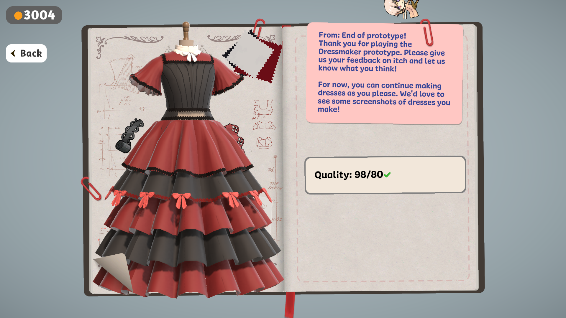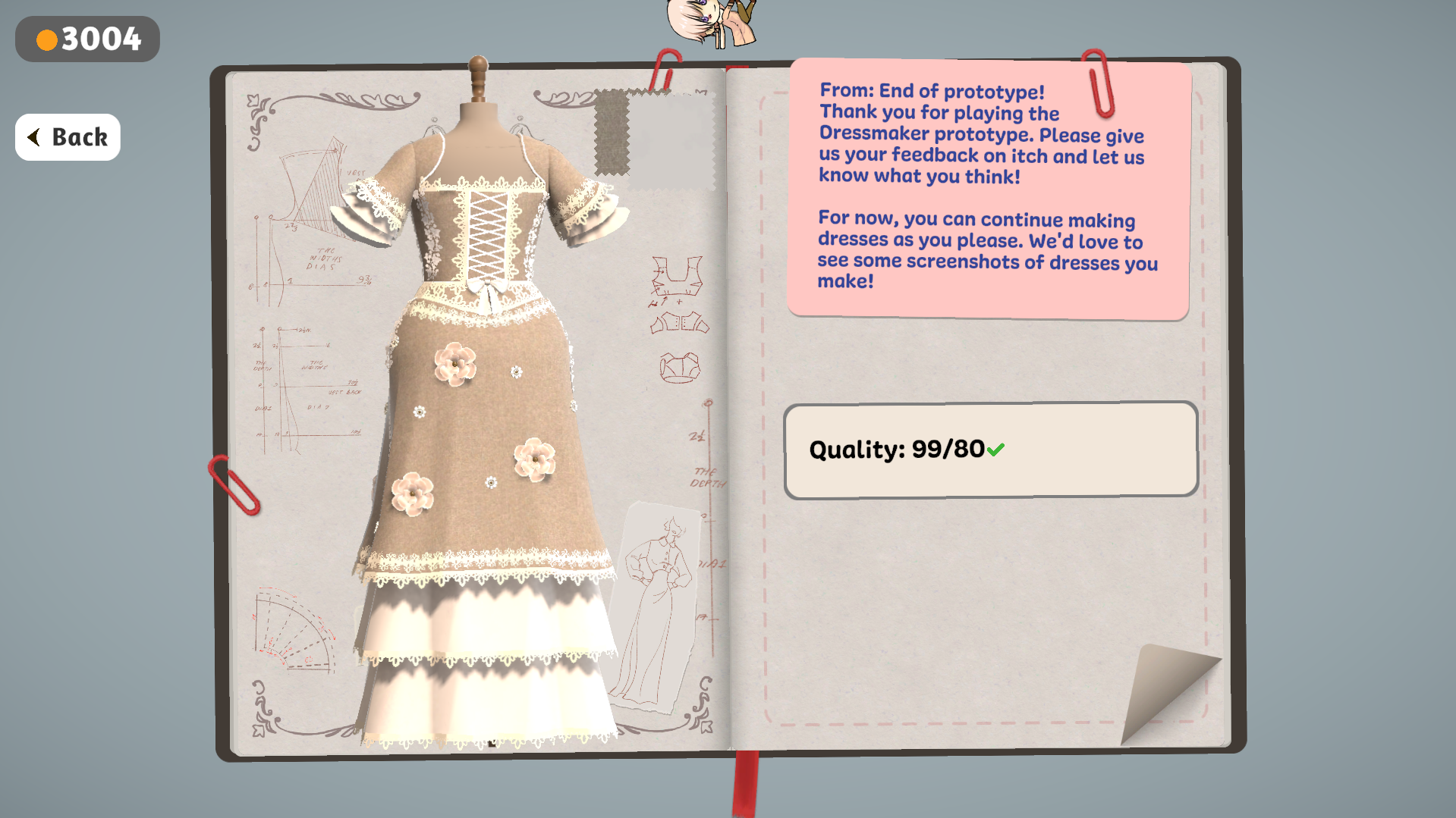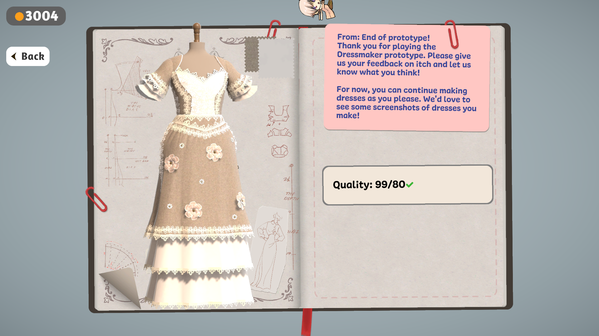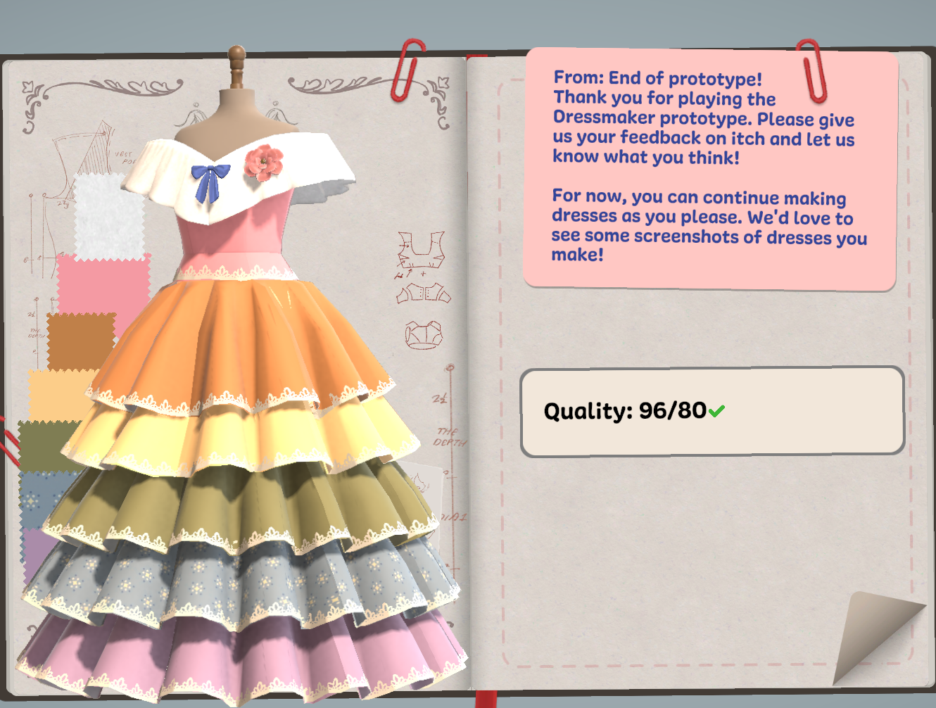 I loved the game! This is my second time playing the prototype, and it's come so far! I love all of the technical changes, like the change to sewing, which makes it so much easier while still keeping the sewing feel. The lace is a little finicky, and I can't seem to put it anywhere but the main body of the dress. Also, I would love an unlimited money feature when it reaches the end, where we can continue making dresses if we'd like. I have so many designs I would like to try, but I run out of money too fast. Also, I think it'd be fun if we got to see the customers in our dresses! still love the game, and really liked the designs that I got to make for people!