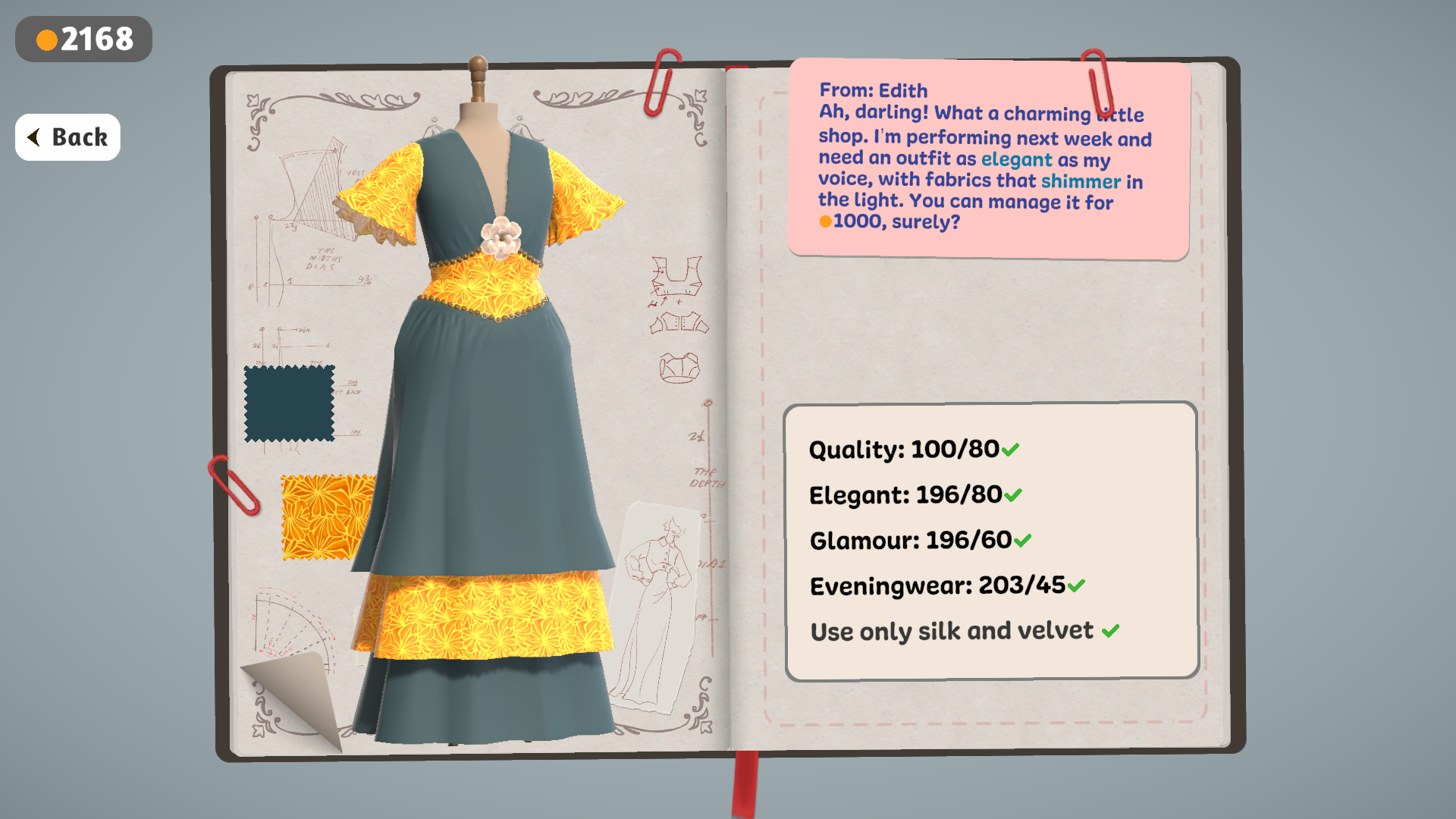 I love it! I hope the steam release has a "creative mode" because i genuinely could sit here making one million dresses forever, forget the customers these are for meeeeeeeeee i want morrreeee <3