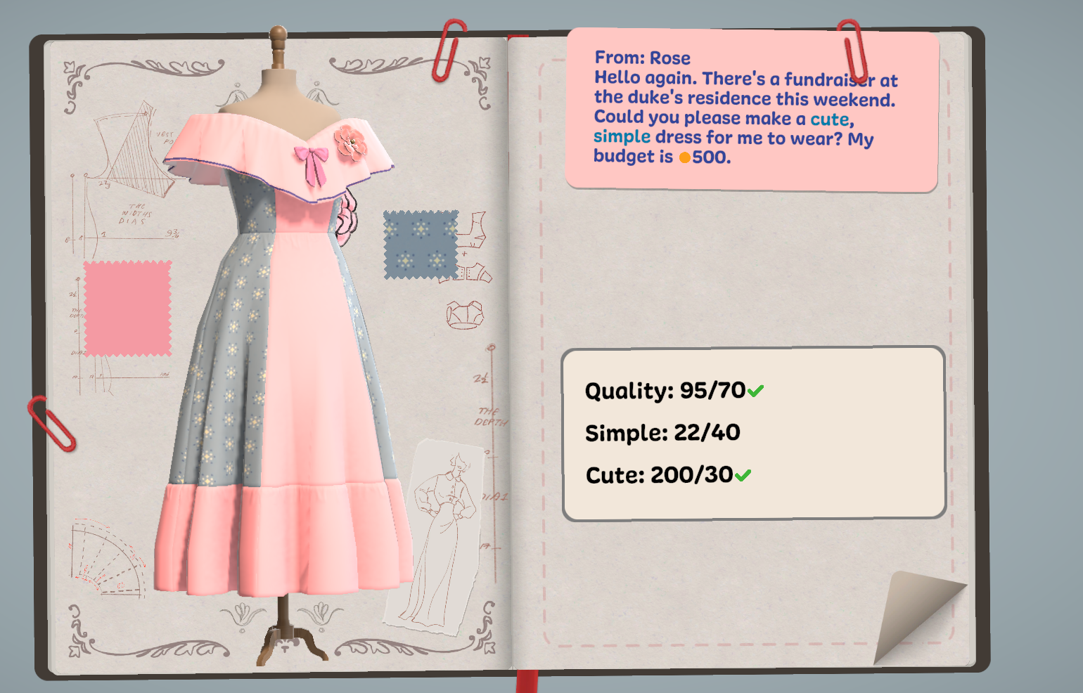 I enjoyed the atmosphere, the music, the attention to detail in this game. I think the bows, trims, and flowers should add to the style points some bows are cute some are elegant but over all i found the process of making a dress very tedious and frustrating. My hand as the "mouse" and the space bar as the foot of the machine did not work together as it should. When you sew you're often pressing your foot on the pedal and guiding with your hand at the same time only stopping really to adjust. The mouse seemed slower than the foot of the sewing machine and made me incredibly frustrated. There needs to be some kind of dopamine sounds you could add once you sew each section and chances to undo the stitches and try again with a seam ripper would be nice. I appreciated the forgiveness about not going over that curve well however it wasn't fun to struggle. As someone who sews these kinds of dresses in real life, this was REALLY realistic in causing frustration lmao. Though as a game I think the point is to be fun. Cutting the patterns was fun tho a snap grid would be nice. decorating the dress was fun however it as frustrating getting trim around the bodice, on the edge of the seam of the sleeves because I couldn't rotate the camera to see what I was doing. Overall this game has REAL potential. Its attention to detail really seems like the creators KNOW how to sew however, it needs work to make it fun to actually play. I would also like the satisfaction of seeing the client WEARING the dress you made. A few ideas for the UI is to have an opt out version and that version be a mini game for the sewing and save the original for hard mode. A few other things, there should be an undo button on trims that is visible because I didn't understand that pressing right click with the scissors will exit you out of trim and pressing the pin again would unpin it? I think I did it right. I hope you guys will continue your development and don't take the feedback too harshly. I want this game, it's wishlisted on steam keep up the good work.