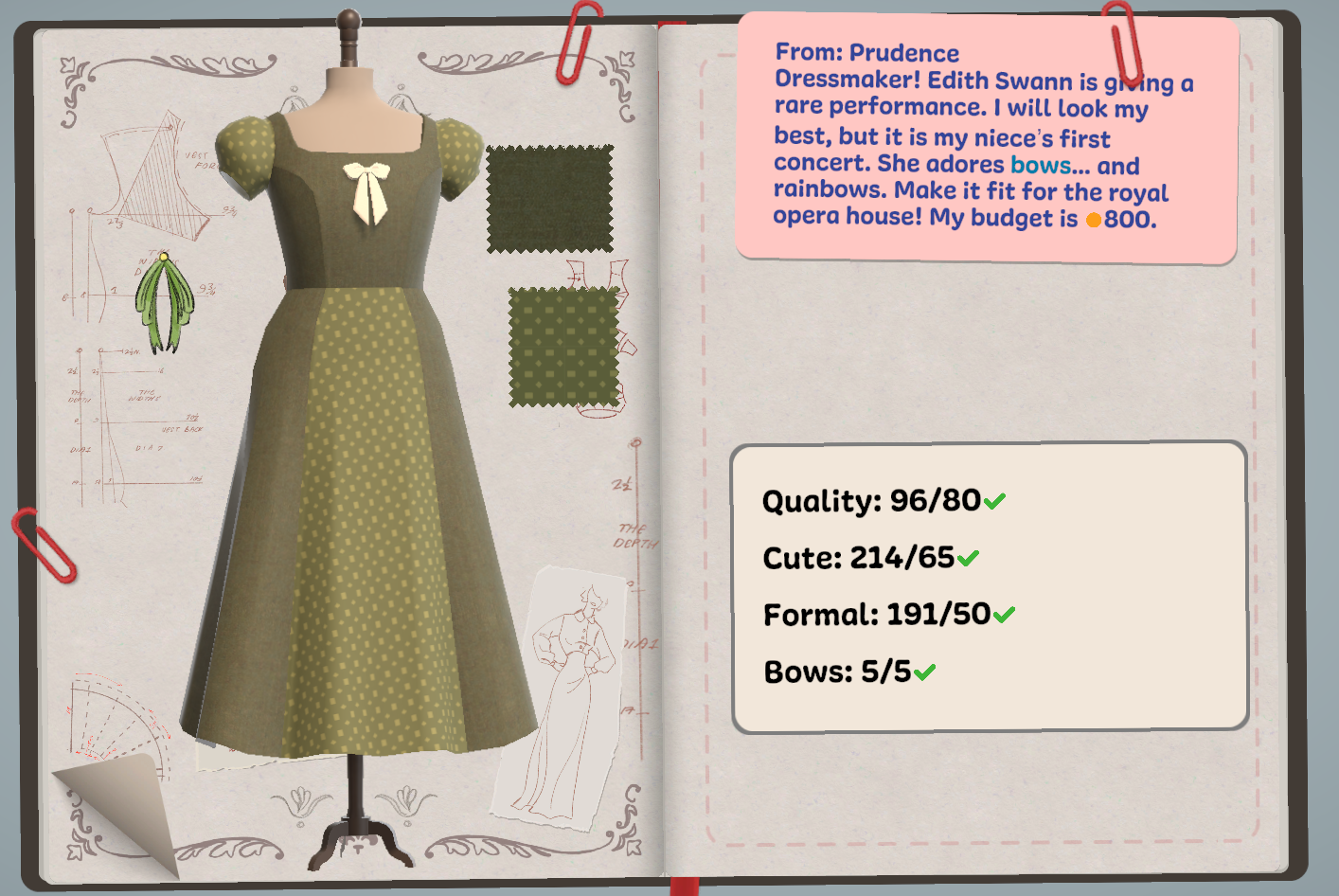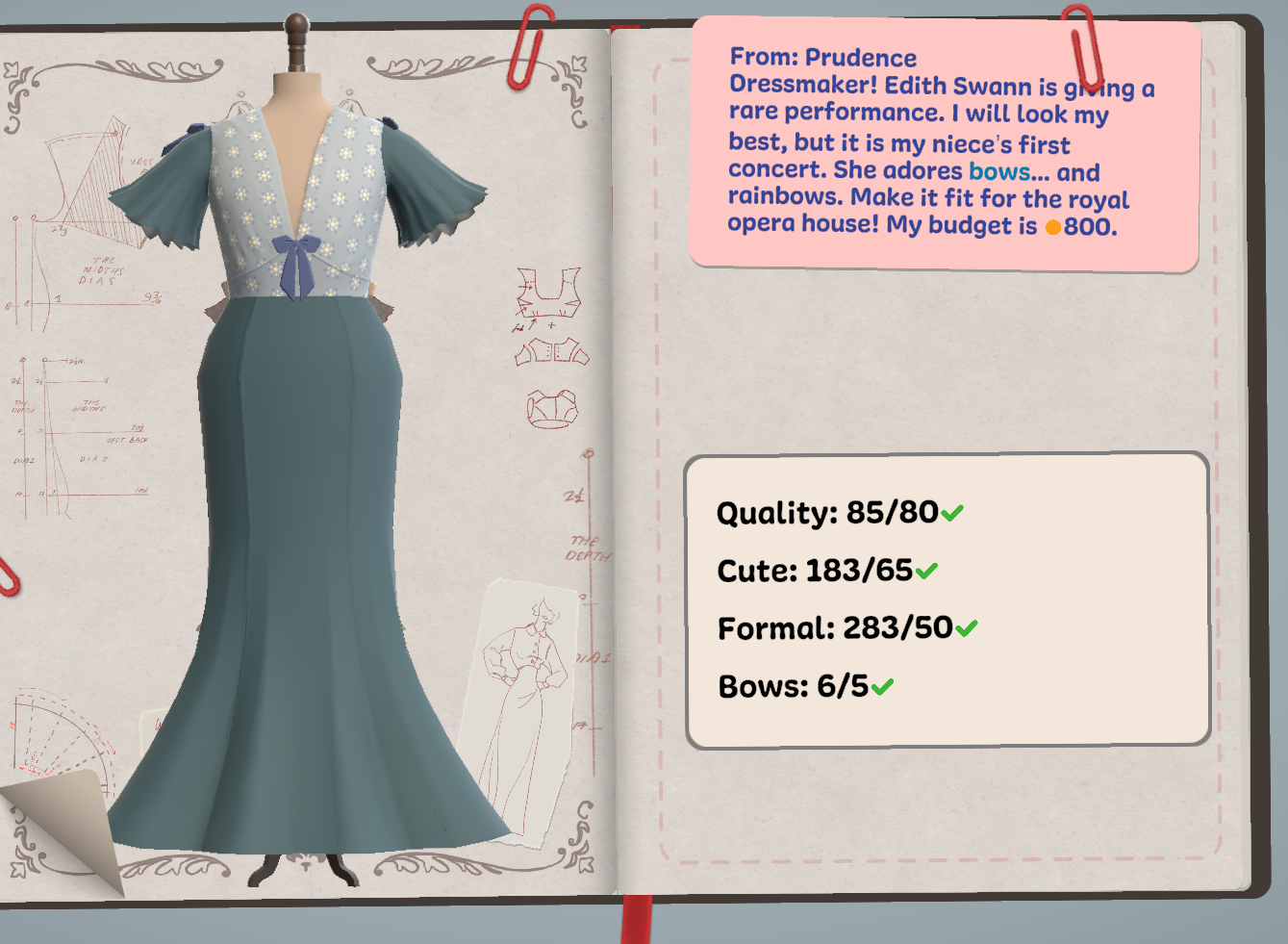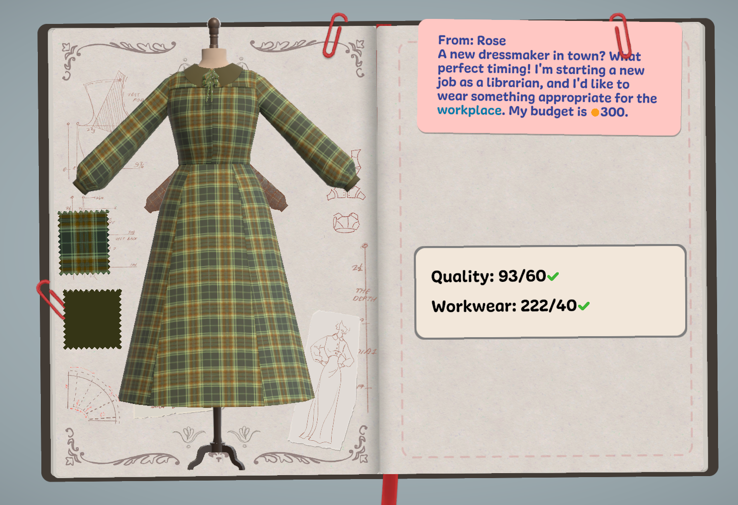 I'd like to see more of a "guide" for sewing (i.e., the line turns yellow or red when you've gone too far), as well as more dress patterns to choose from. Another thing that would be really helpful would be the option to roughly color in the sketch with the fabric/pattern and to be able to reference the sketch as I'm purchasing/cutting the fabric! I kept finding myself going back to my sketch or going from the cutting table to the mannequin often, just to make sure I was happy with the pieces I was grabbing. I'd also like a layering and sizing option, primarily for the accessories. Overall, though, this is such a cute, cozy game that I would love to play more of!!